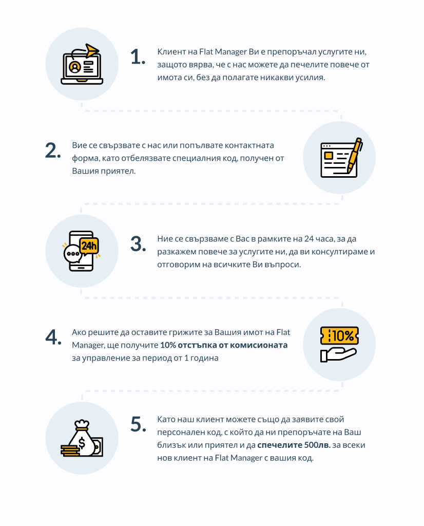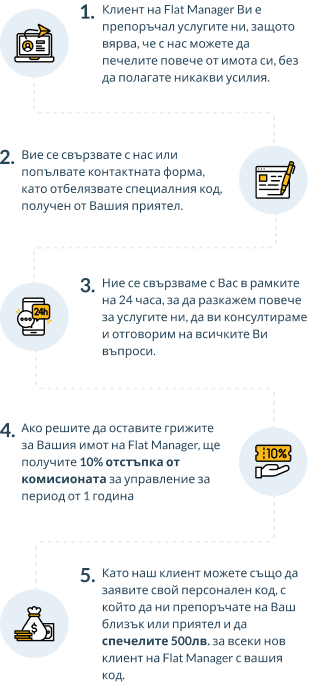 Поздравления! Вие сте получили специален код от наш лоялен клиент, което Ви прави част от Referral програмата на Flat Manager и можете да се възползвате от 10% отстъпка от комисионата за управления на Вашия имот за цяла 1 година!