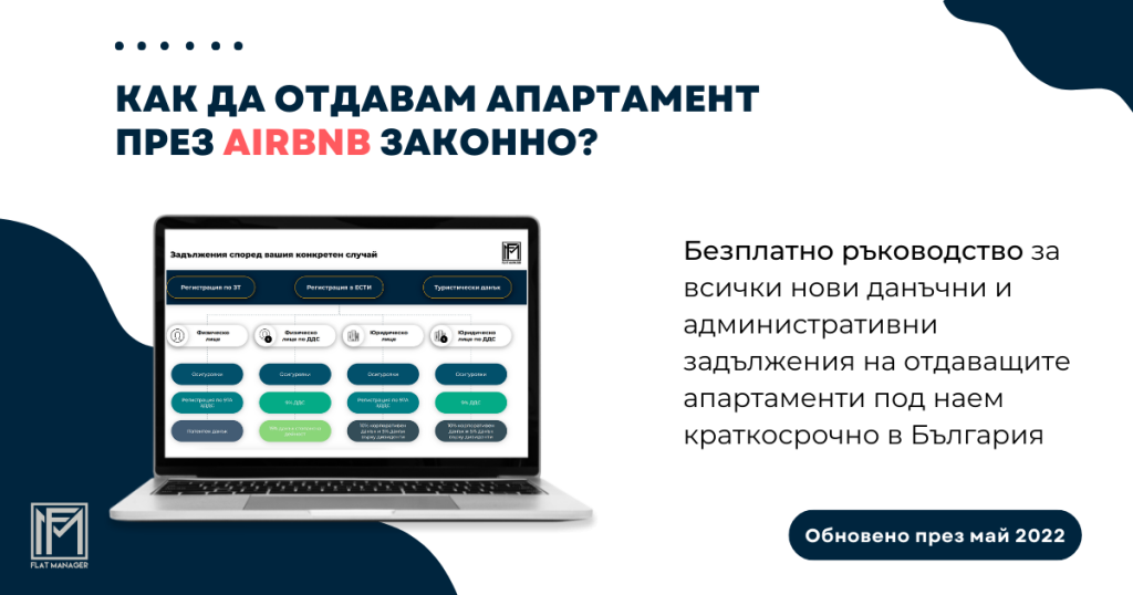 Как да отдаваме апартамента си през Airbnb и Booking.com законно и всичко важно за регистрацията в Airbnb и Booking. Необходимо ли е съгласието на съседите? Какви данъци за наем на апартамент трябва да плащаме? Какви са административните ни задължения? Намерете отговорите на тези въпроси в безплатното ръководство на Flat Manager.