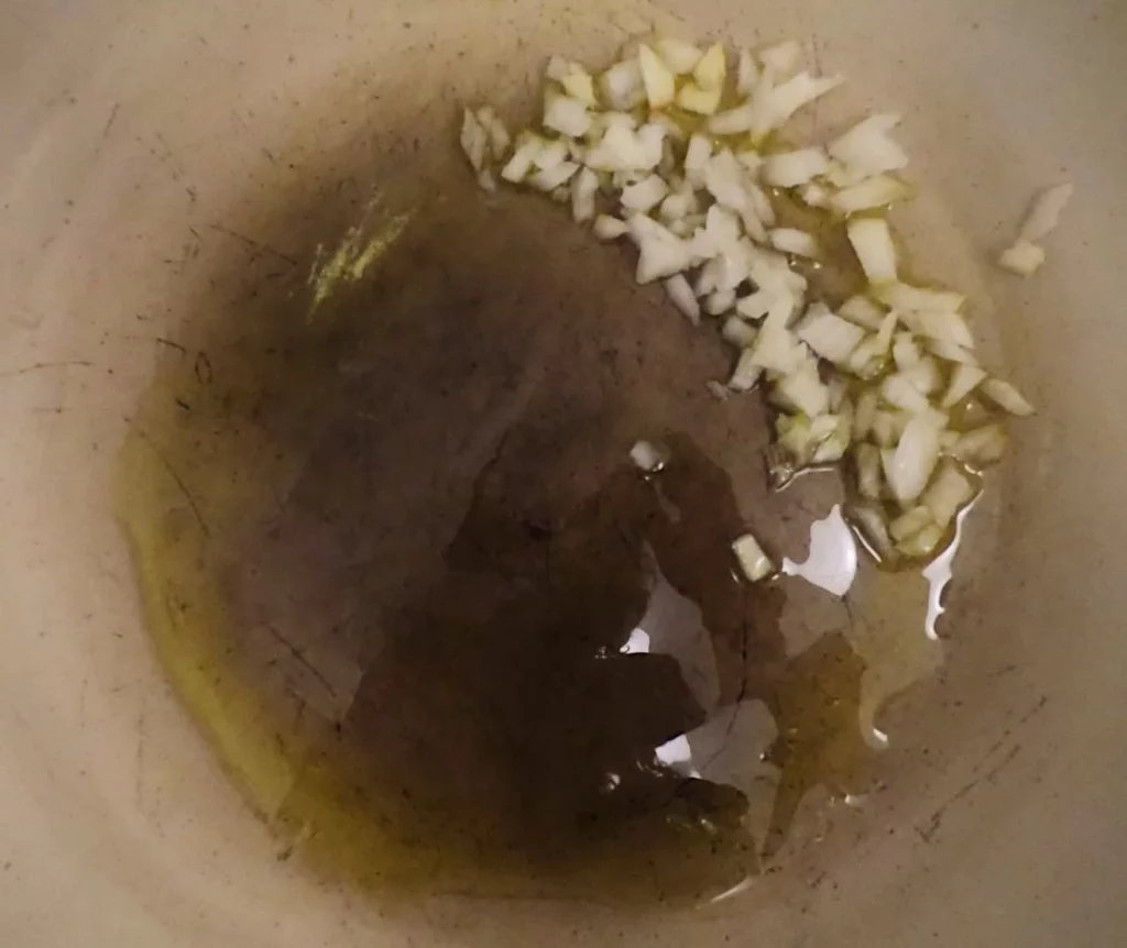 Start by heating up a pan with olive oil. When it’s hot, put half of a finely chopped onion and let it cook until it’s golden but make sure not to burn it.