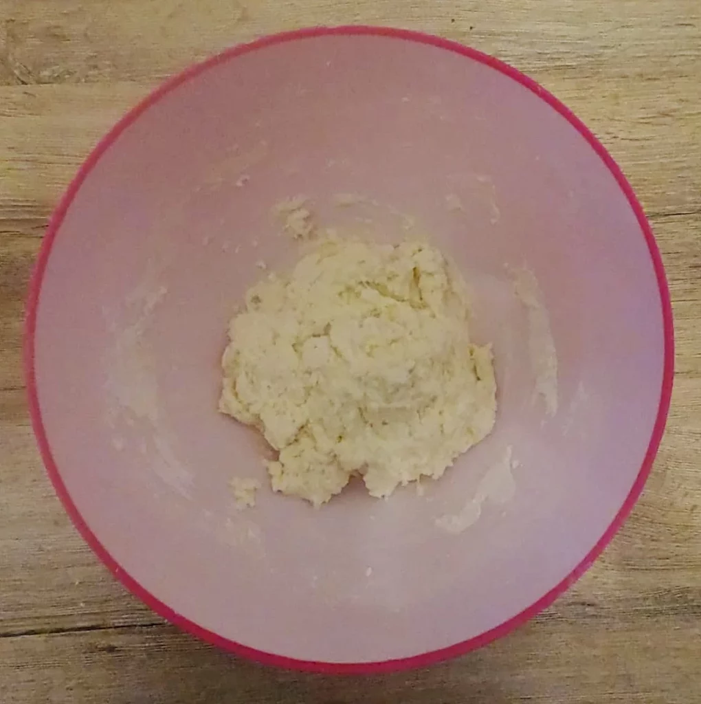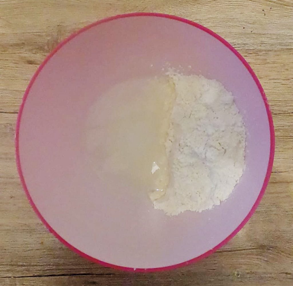 Place about half of the flour on the side of a bowl (the best would be a wooden or glass bowl, but if you don’t have either of them don’t worry! I’ll teach you a trick to make sure the dough doesn’t stick to the surface).