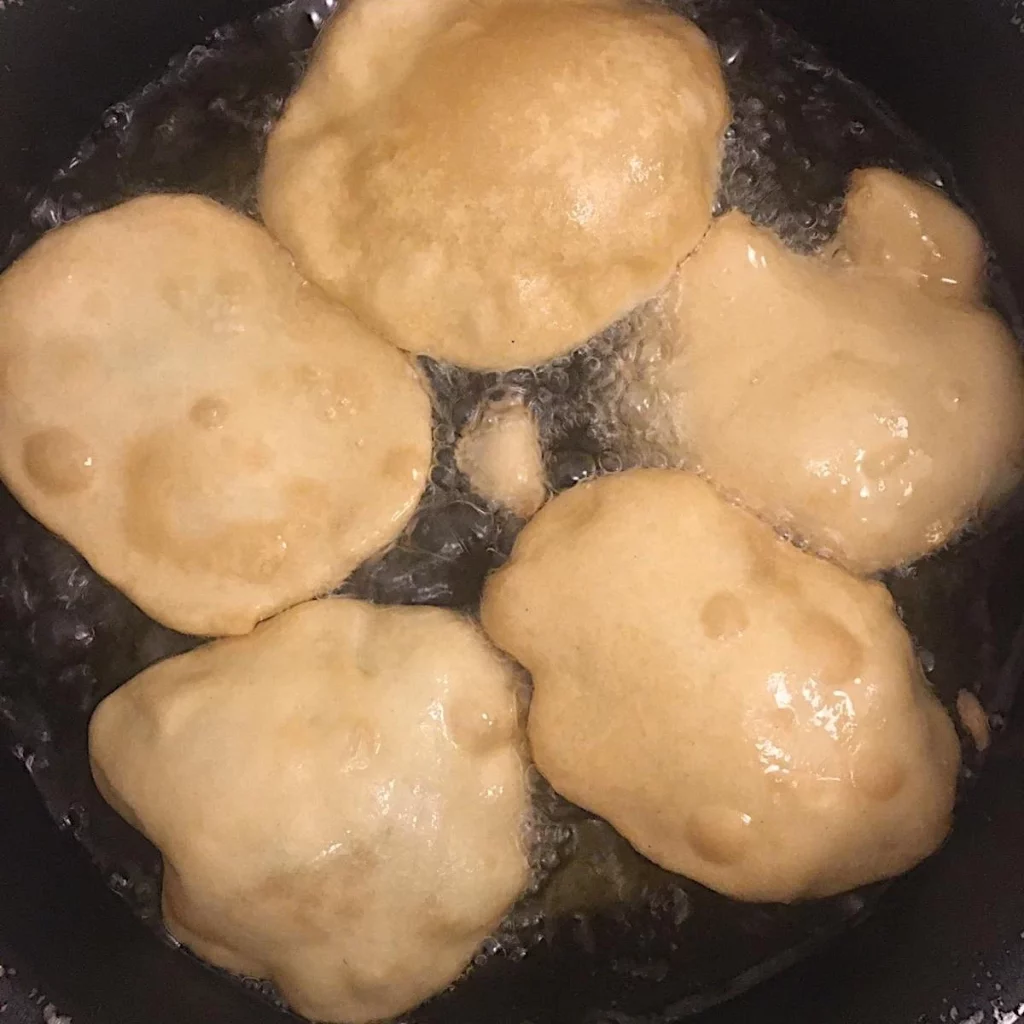 After 6-8 hours the dough should have doubled in size. Heat up the sunflower oil in a large pot.