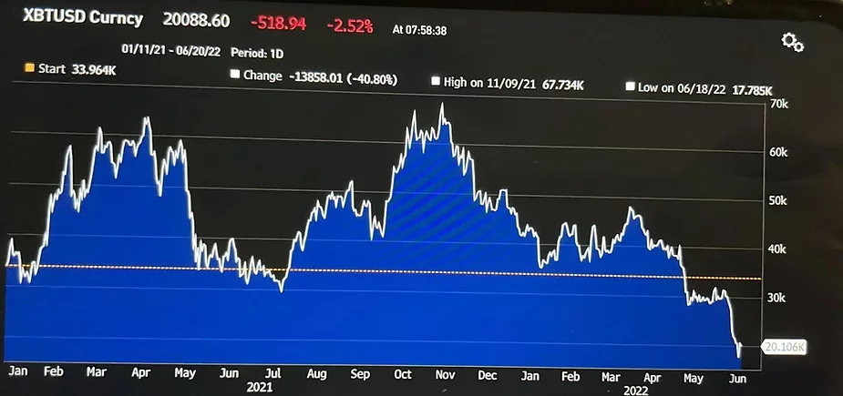 1000лв инвестирани в SP500 или в Биткойн по същото време днес щяха да са съответно 967лв или 592лв.