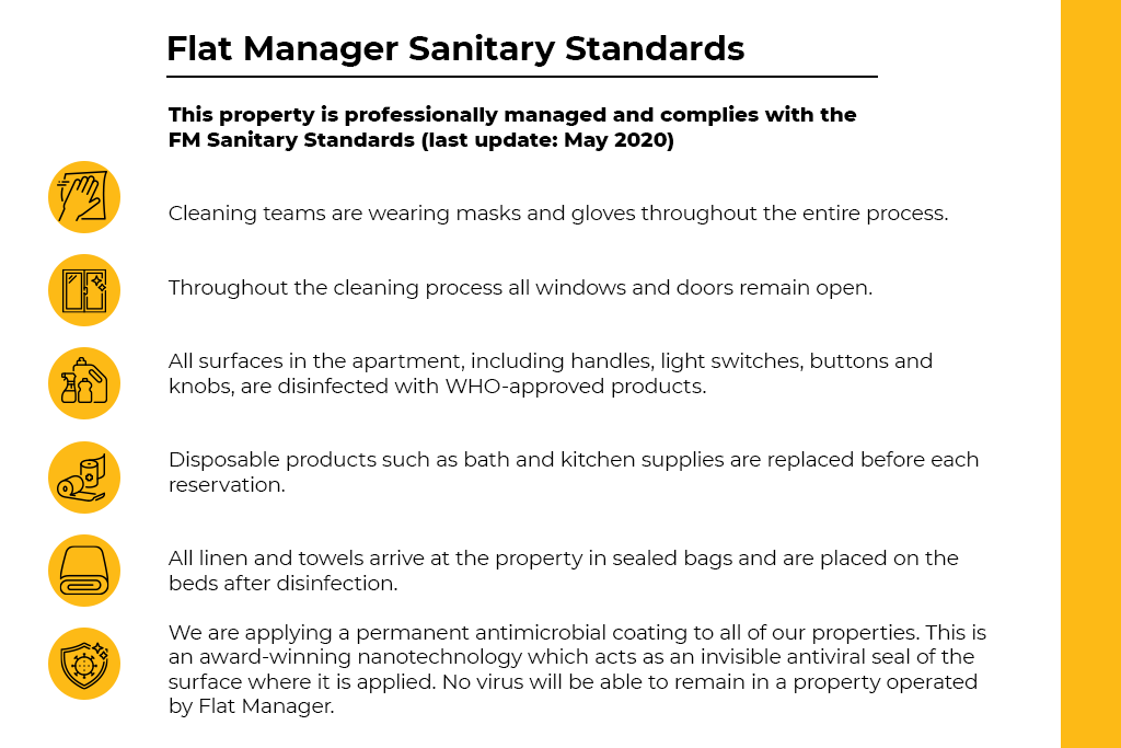 Домакините трябва да се постараят чистотата в апартамента да е безупречна и да си поставят високи стандарти и правила за почистването. Важно също е и да информират гостите си за това и да създадат сигурност и доверие у тях. Ето какви санитарни стандарти определихме ние от Flat Manager за нашите апартаменти: